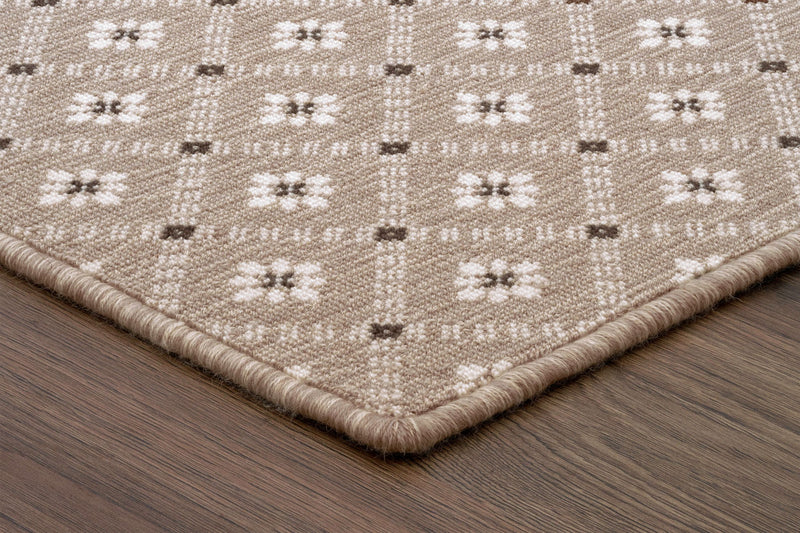 The WELLSBORO carpet by STARK features a classic diamonds pattern woven from 100% wool using traditional Wilton construction. Crafted on jacquard looms, this method pulls selected yarns to the surface to form loops while hiding others in the background, allowing for intricate detail and color versatility. Varying pile heights add texture and depth to this timeless design.